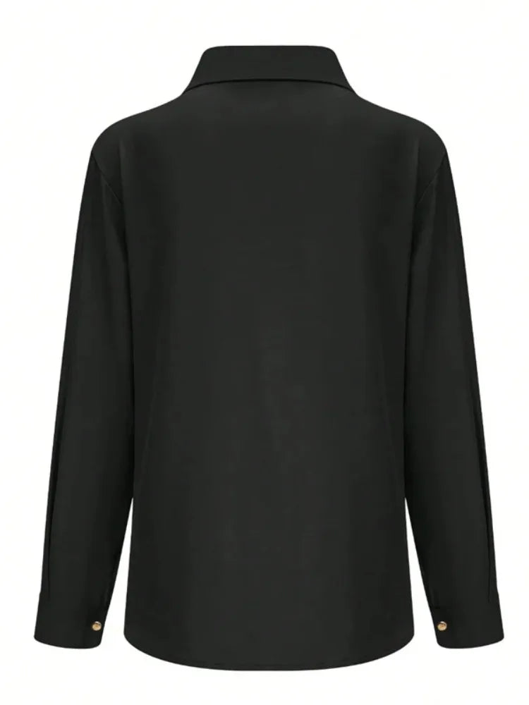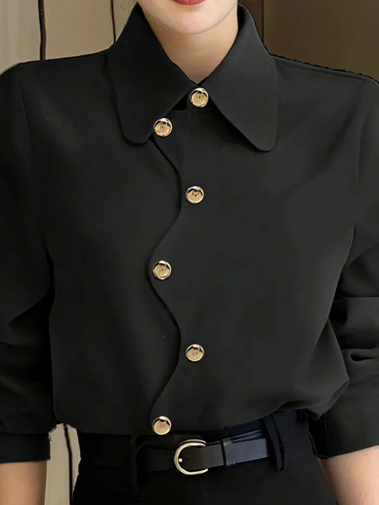 2026 New Women's Black Asymmetrical Gold Button BlouseTurn Down Collar Long Sleeve Loose Urban Casual Office Shirt Tops