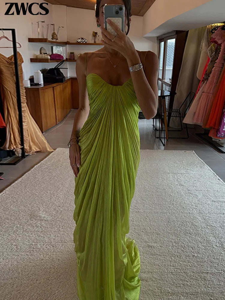Green Pleated Party Gowns 2026 Summer New Female Sexy Off Shoulder Sleeveless Backless Sling Dresses Women's Solid Long Dress