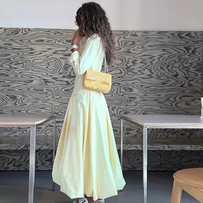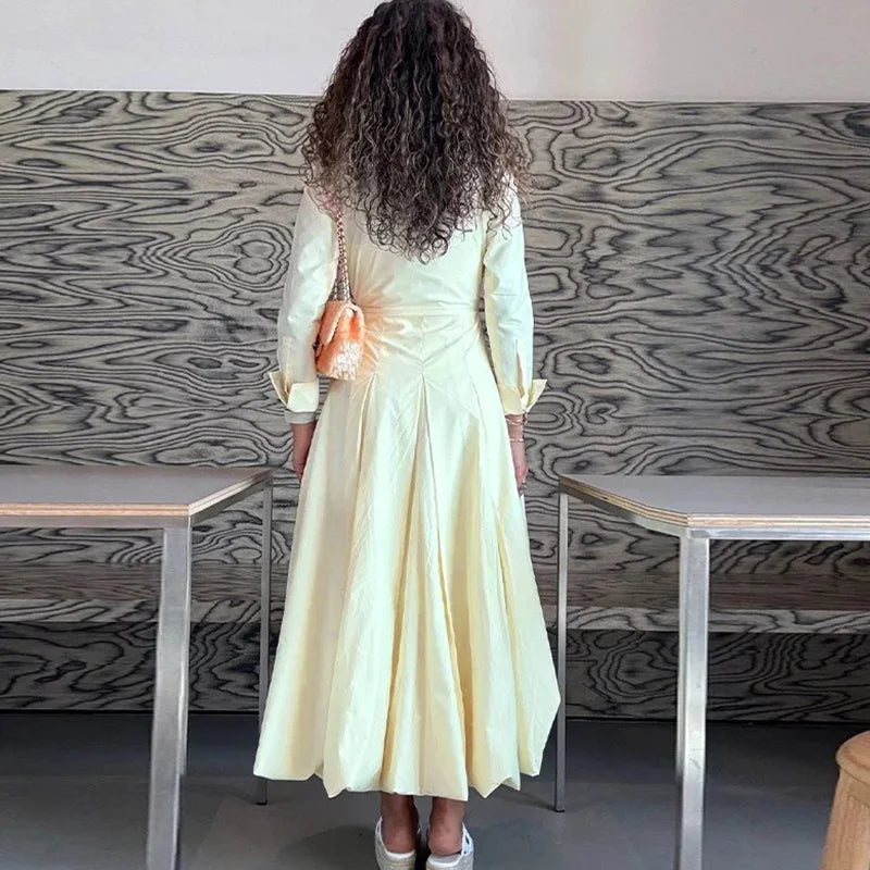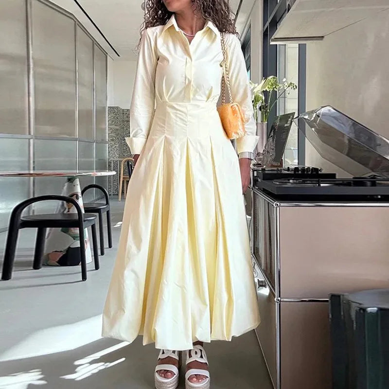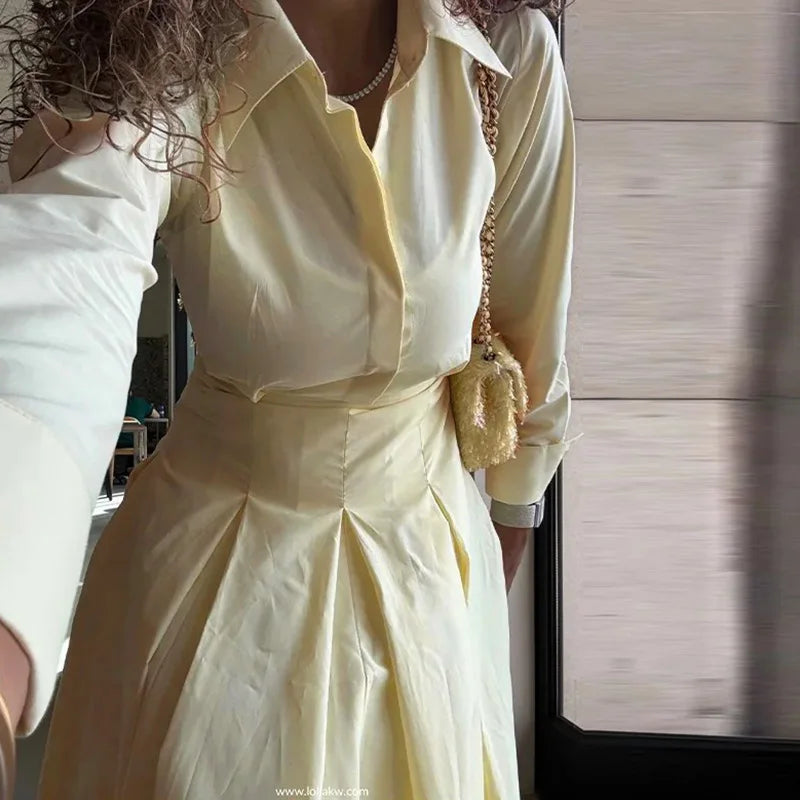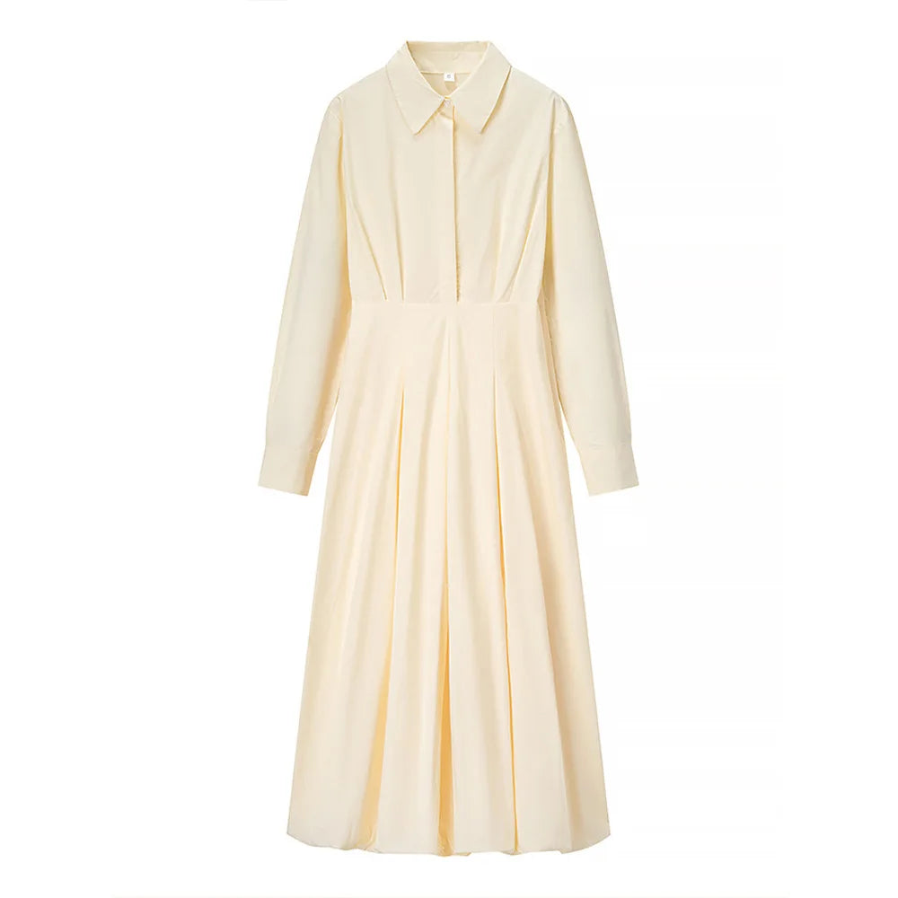 PRINTKAOIR Office Shirts Dressess for Woman Laple Waist Cinching Long Sleeve Pleated Female Dress 2025 Autumn Chic Lady Vestidos
